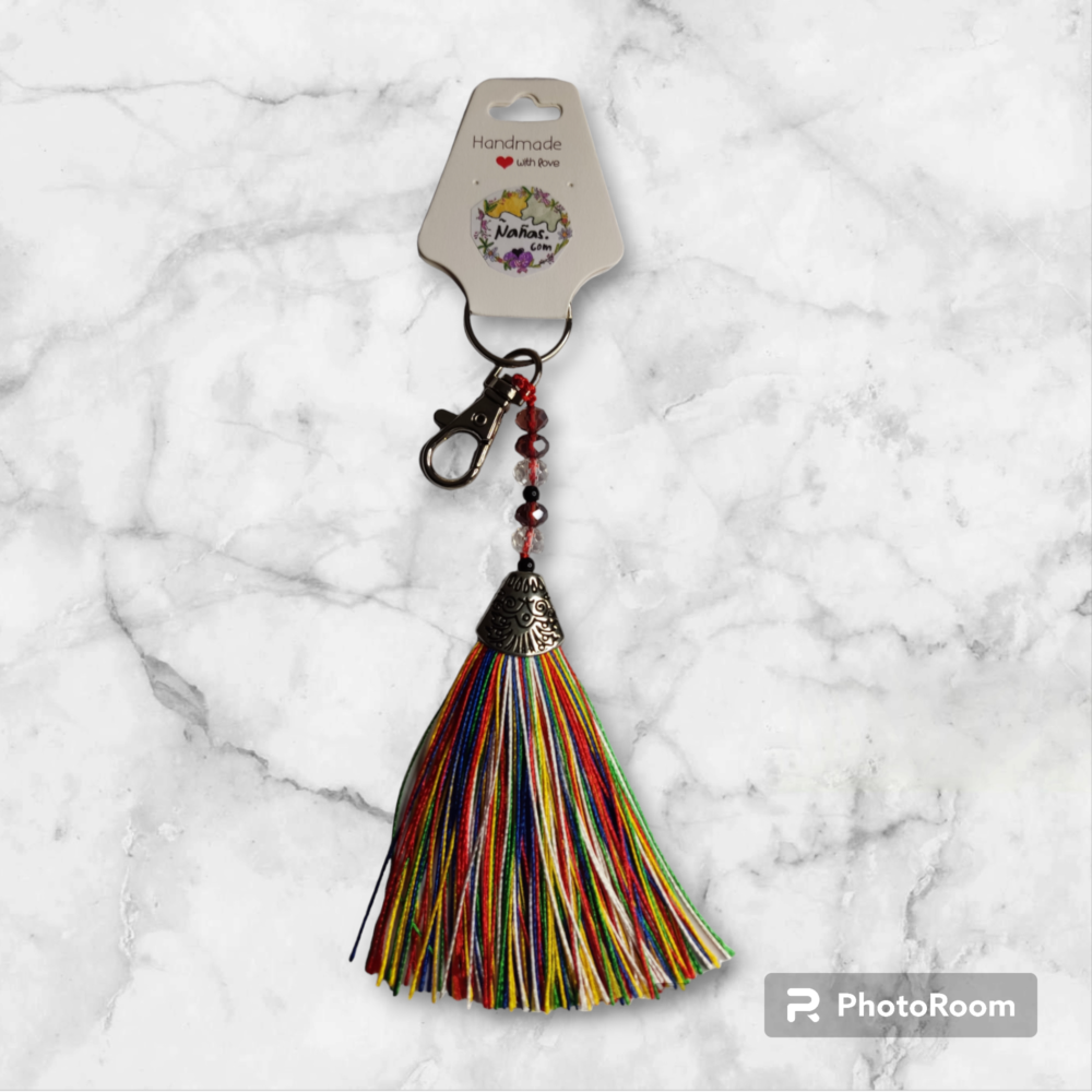Llavero realizado con mostacillas e hilo en color morado y accesorios en plata.